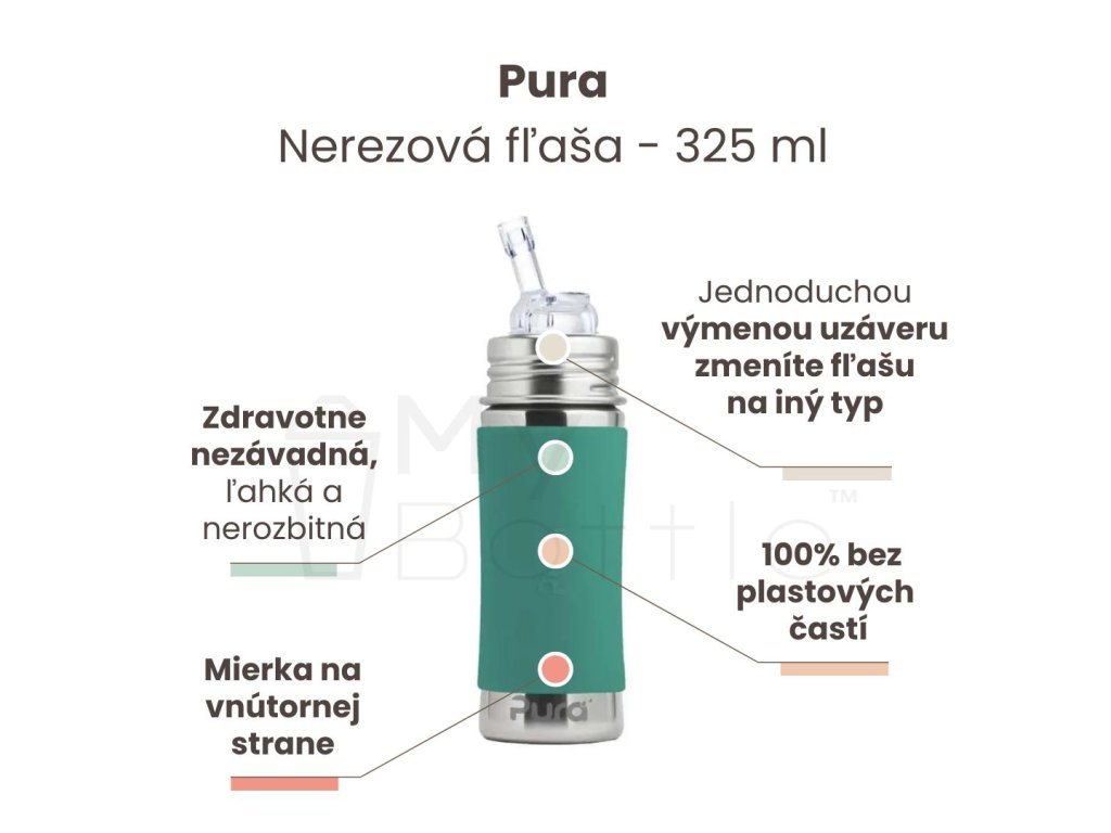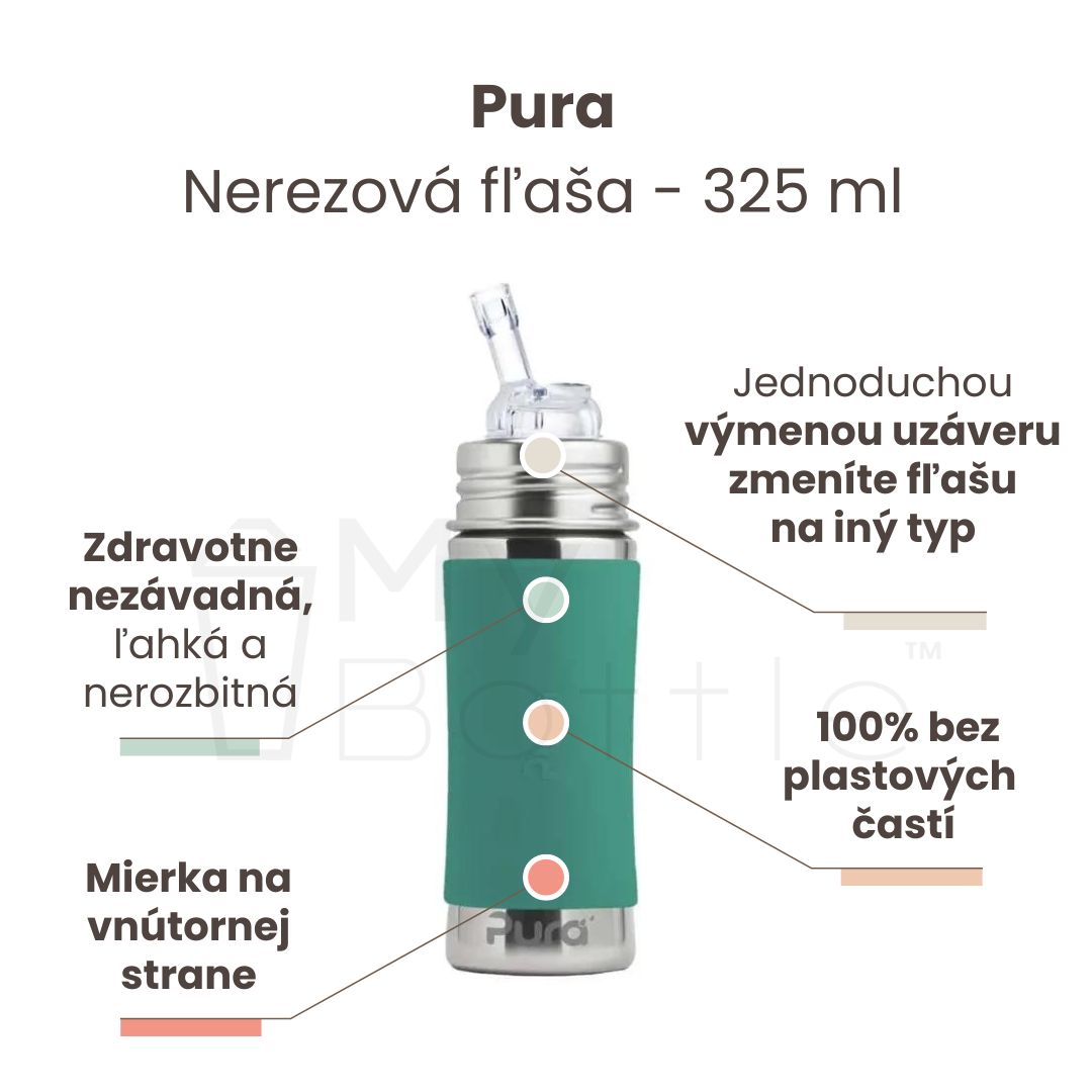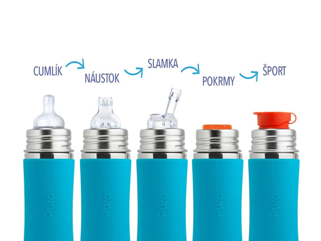 Výhodou nerezovej fľaše Pura je, že sa prispôsobuje a “rastie” s vašim dieťaťom. Jednoduchou výmenou viečka sa fľaša mení z dojčenskej fľaše s cumlíkom na fľašu s náustkom, slamkou alebo športovým uzáverom, alebo s použitím tesniaceho disku na pohárik na príkrmy a drobné občerstvenie. Jednu a tú istú fľašu, tak môžete používať mnoho rokov. Takto jednoducho šetrite nielen peniaze, ale pomáhate aj životnému prostrediu.
