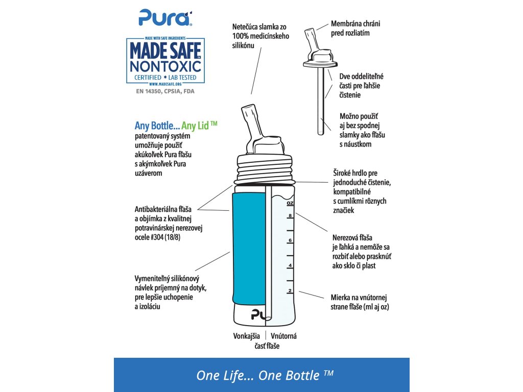 Silikónová slamka Pura má hrot s ventilom, ktorý zabraňuje rozliatiu. Slamka má odnímateľnú vnútornú trubicu a je dvojdielna, čo zabezpečuje jednoduché čistenie. Navyše z nej môžete piť dvoma spôsobmi vzpriamene ako cez klasickú slamku (s pripevnenou vnútornou trubicou slamky) alebo naklonením fľaše (s odstránenou vnútornou trubicou slamky).